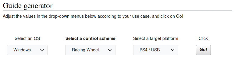 Together with GoDlike we worked on improving the wiki experience. The main page was refreshed and simplified. It now has a guide generator. The use case is selected using three drop-down menus: OS / control scheme / target platform (screenshot below).